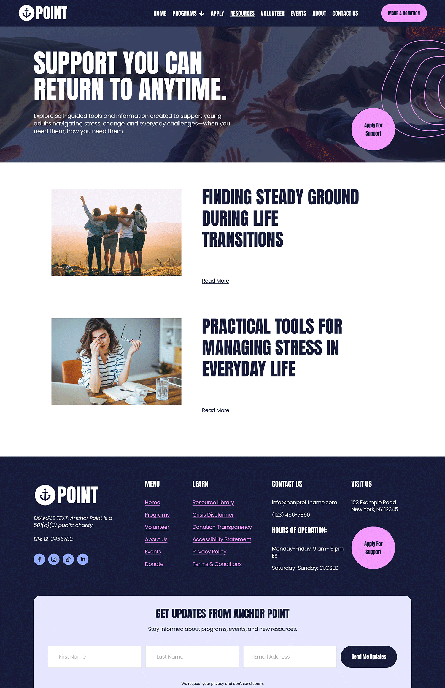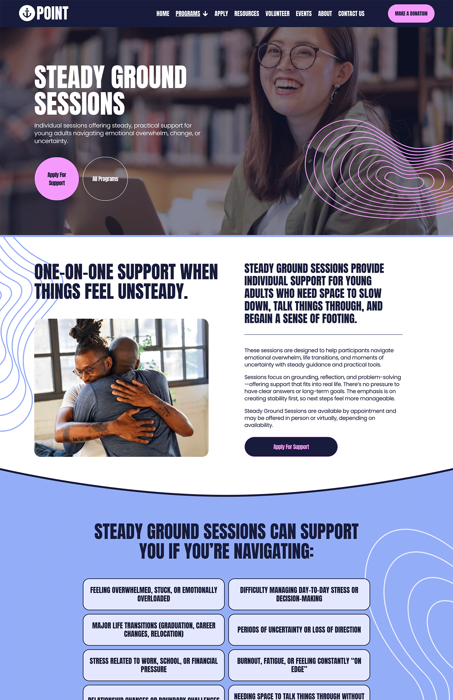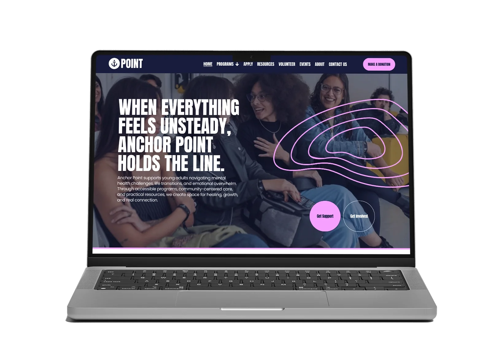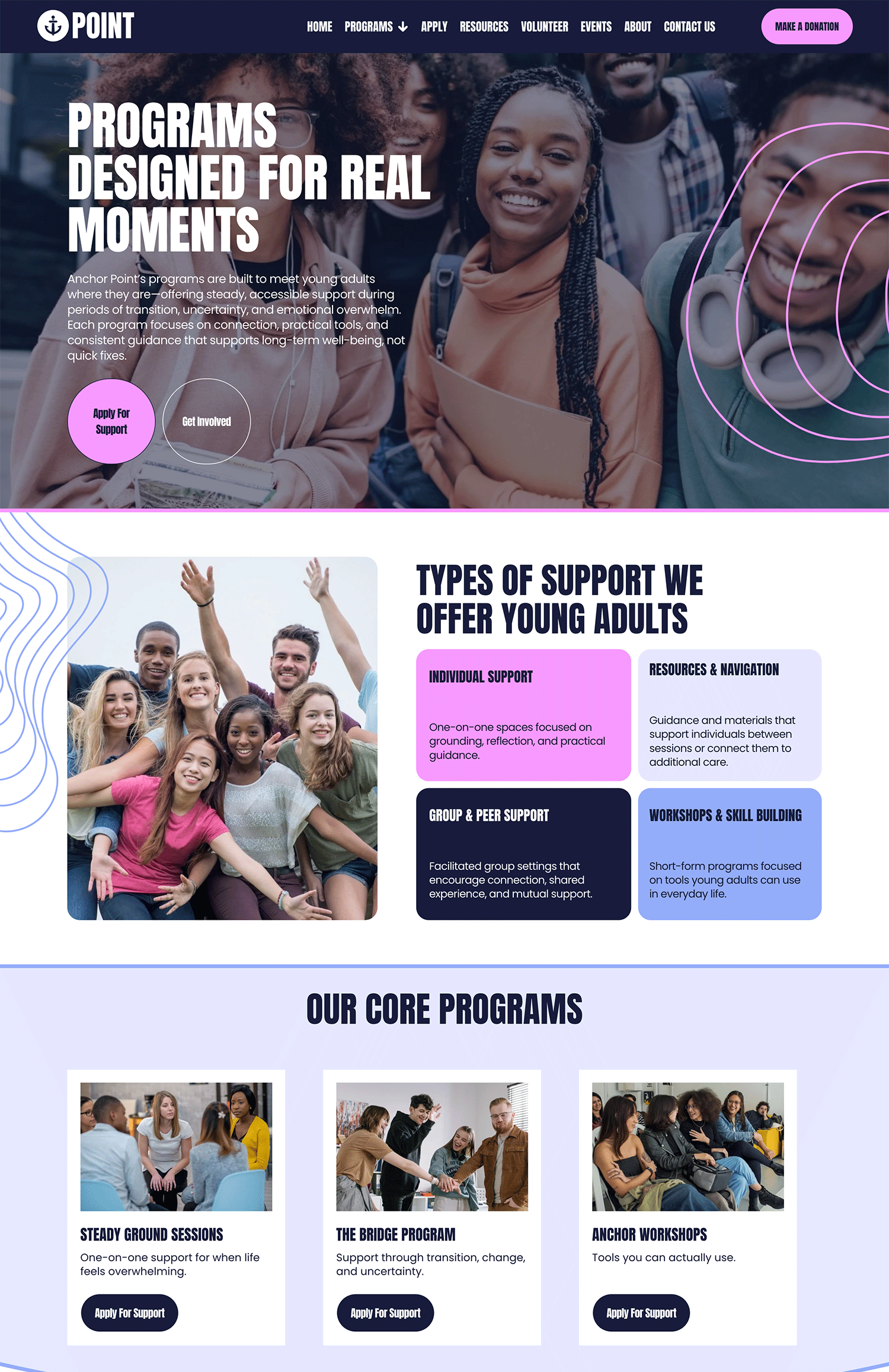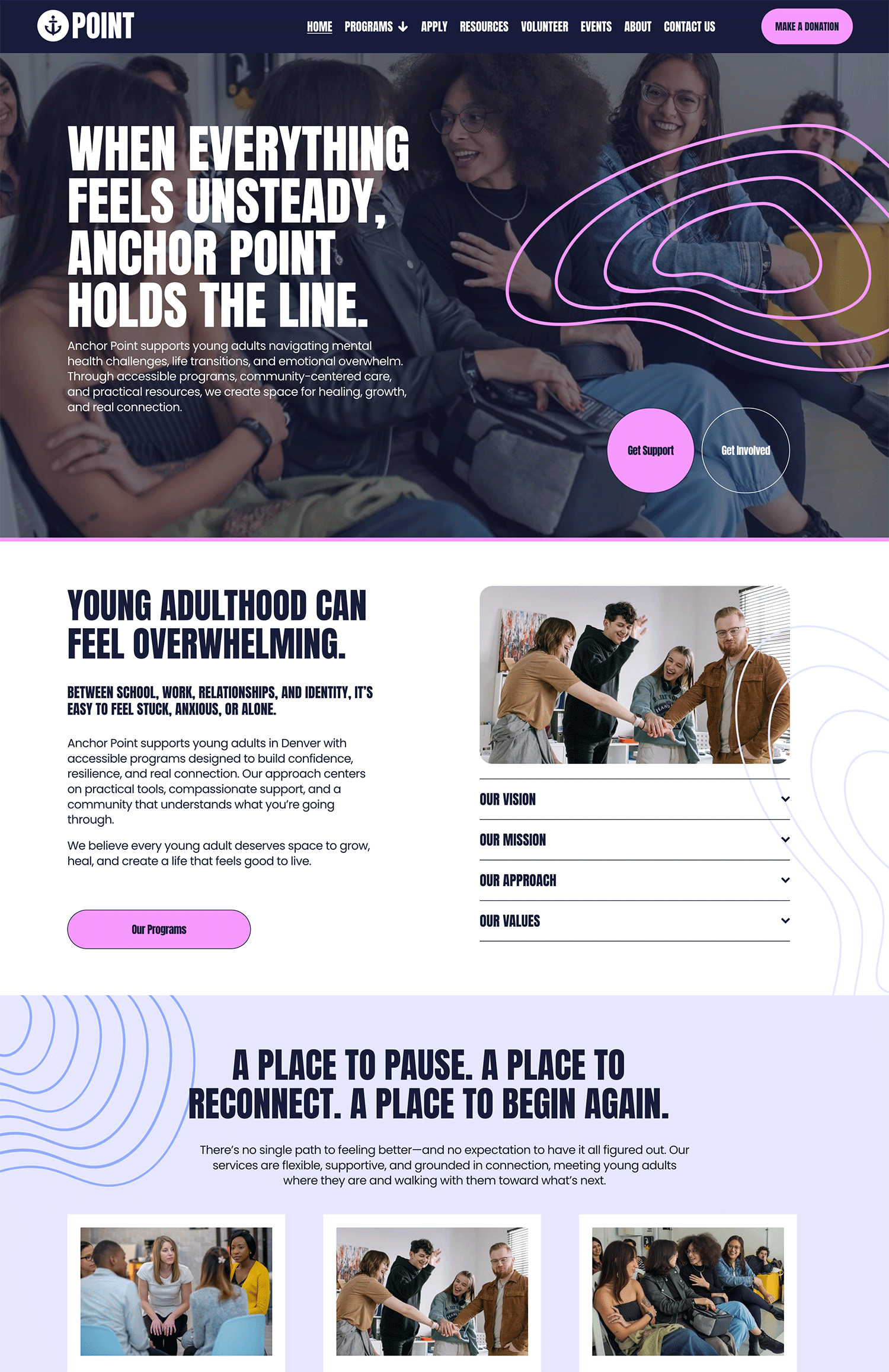 With bold design, clear typography, and vibrant visuals, Anchor Point creates a modern, approachable website that resonates with younger audiences while staying accessible and easy to manage in-house. Each page is designed to clearly explain your work and guide visitors toward meaningful next steps.