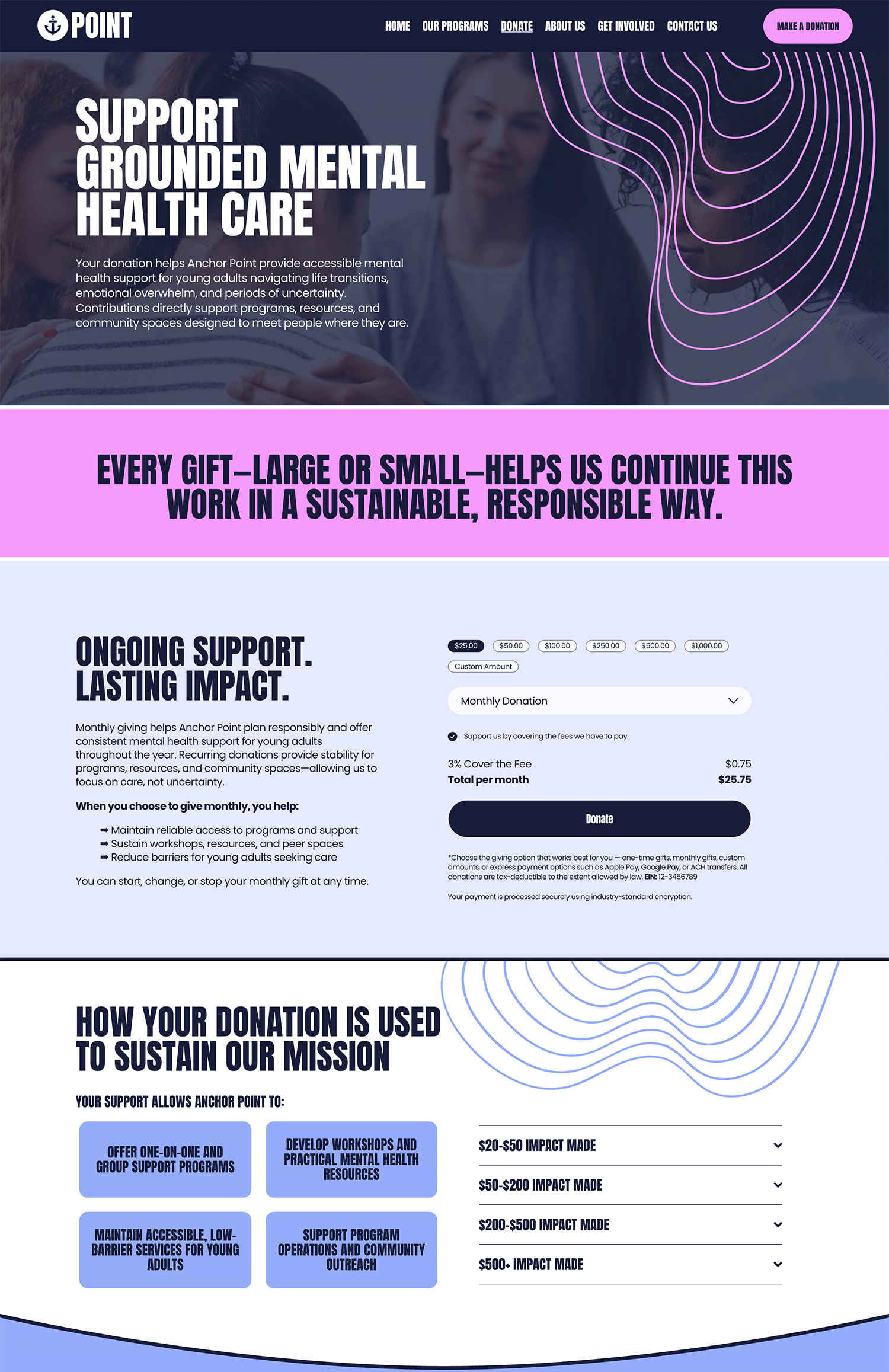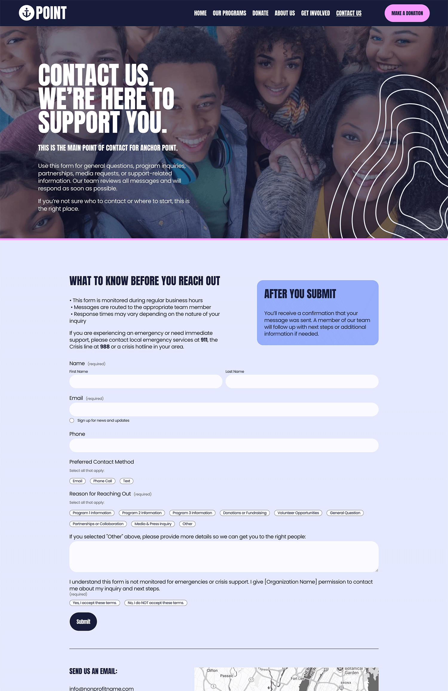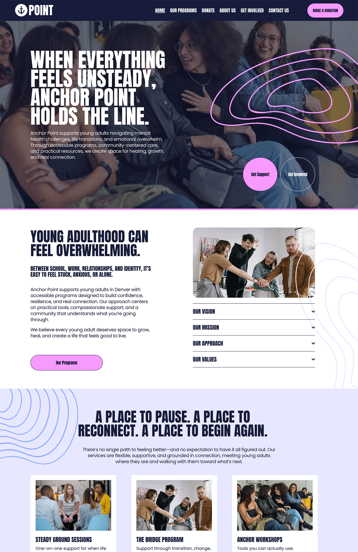For organizations ready for a more robust online presence, the full Anchor Point template offers 15+ additional pages and deeper storytelling to support long-term growth.