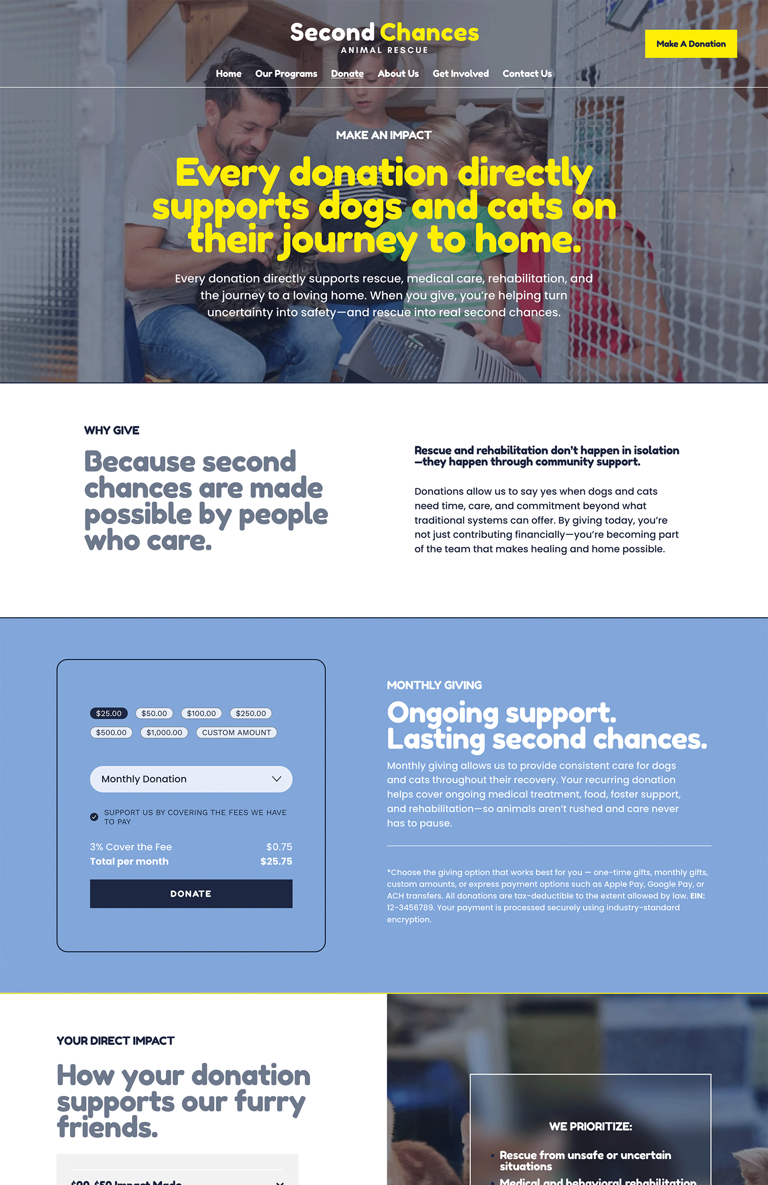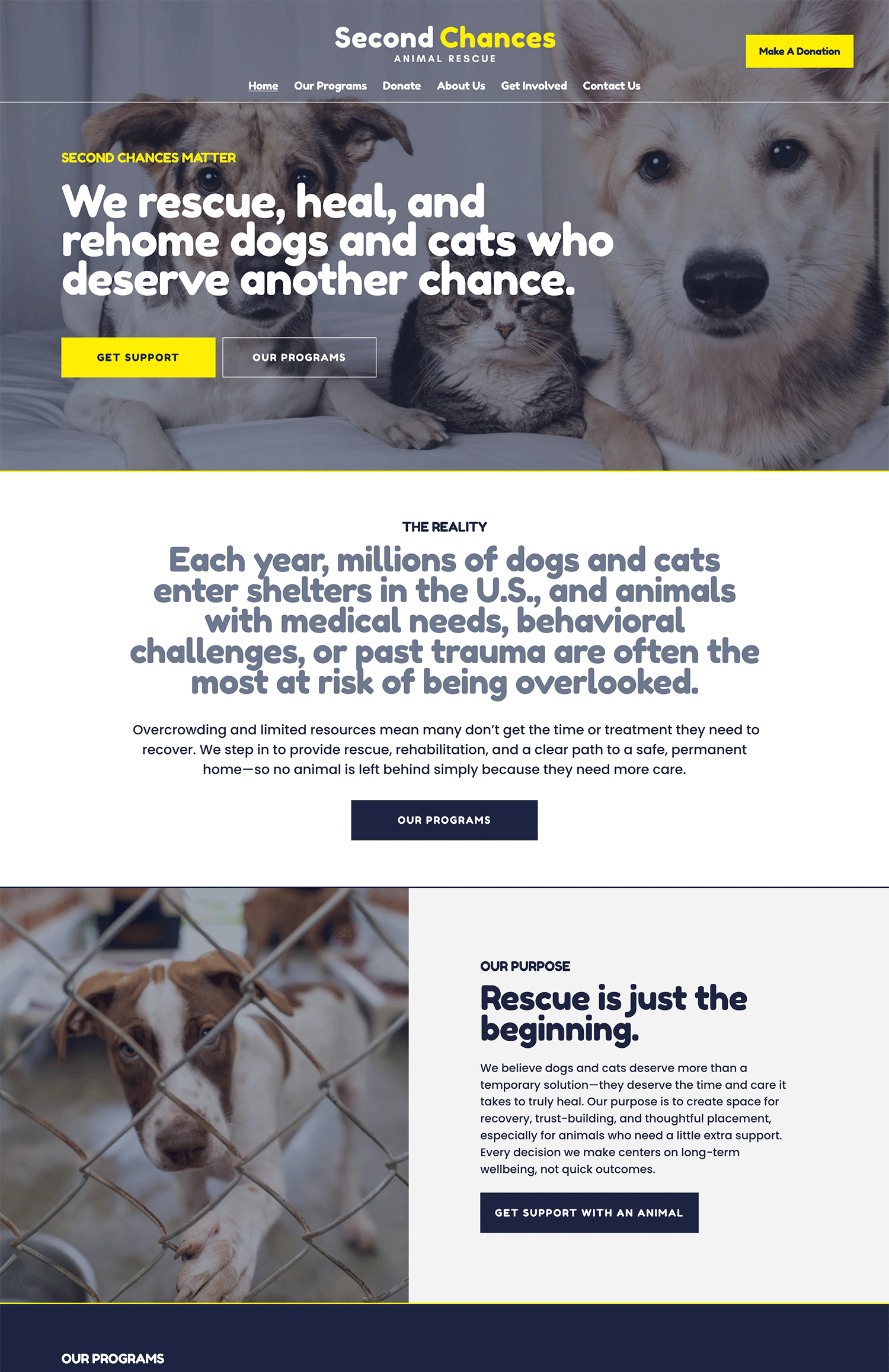 Perfect for dog and cat rescues, foster-based organizations, and animal welfare nonprofits, Second Chance helps organizations communicate their mission, impact, and donation needs in a warm, trustworthy, and action-driven way.