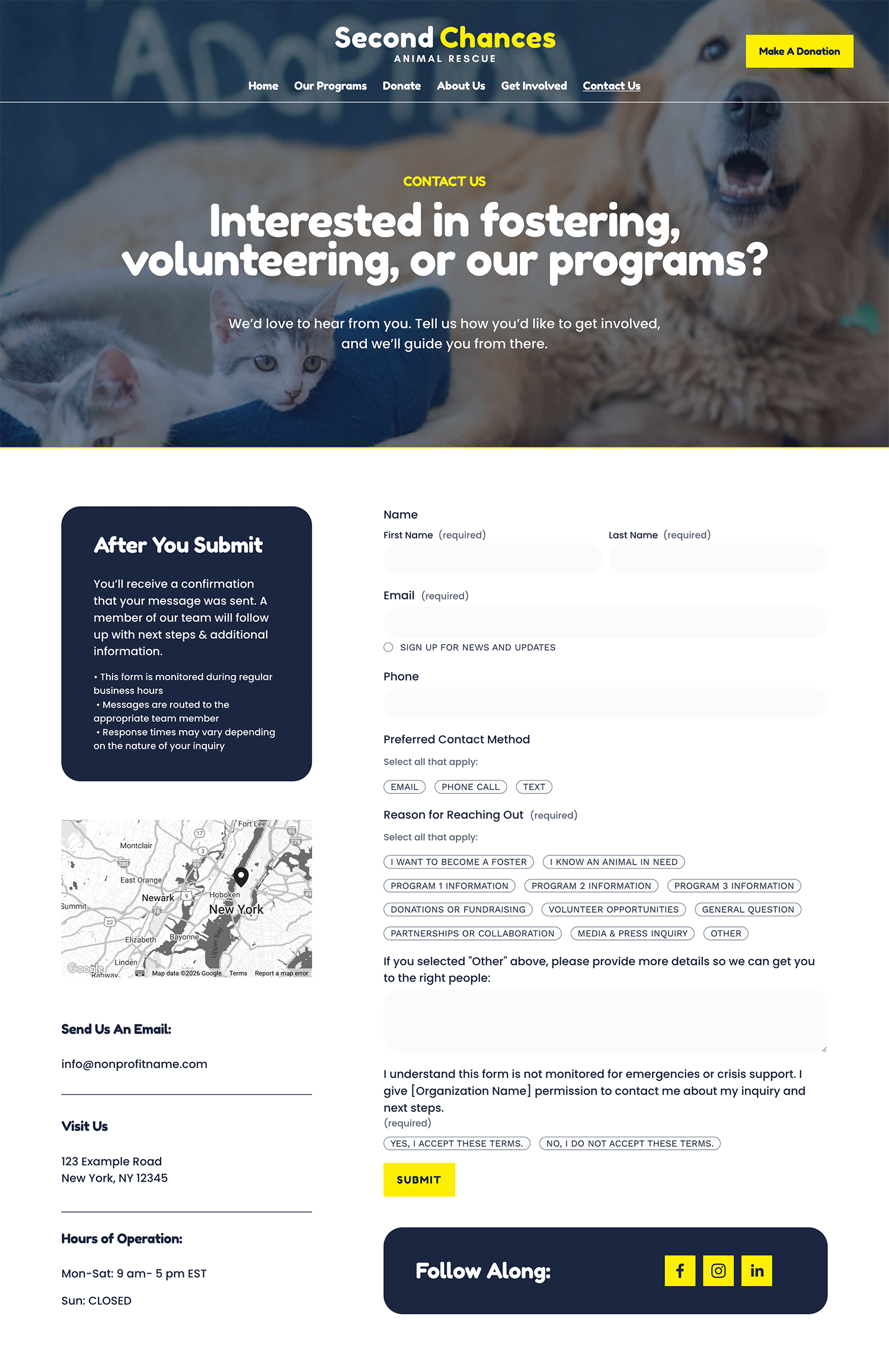 Pre-formatted form for program, volunteer, donor, and partnership inquiries.